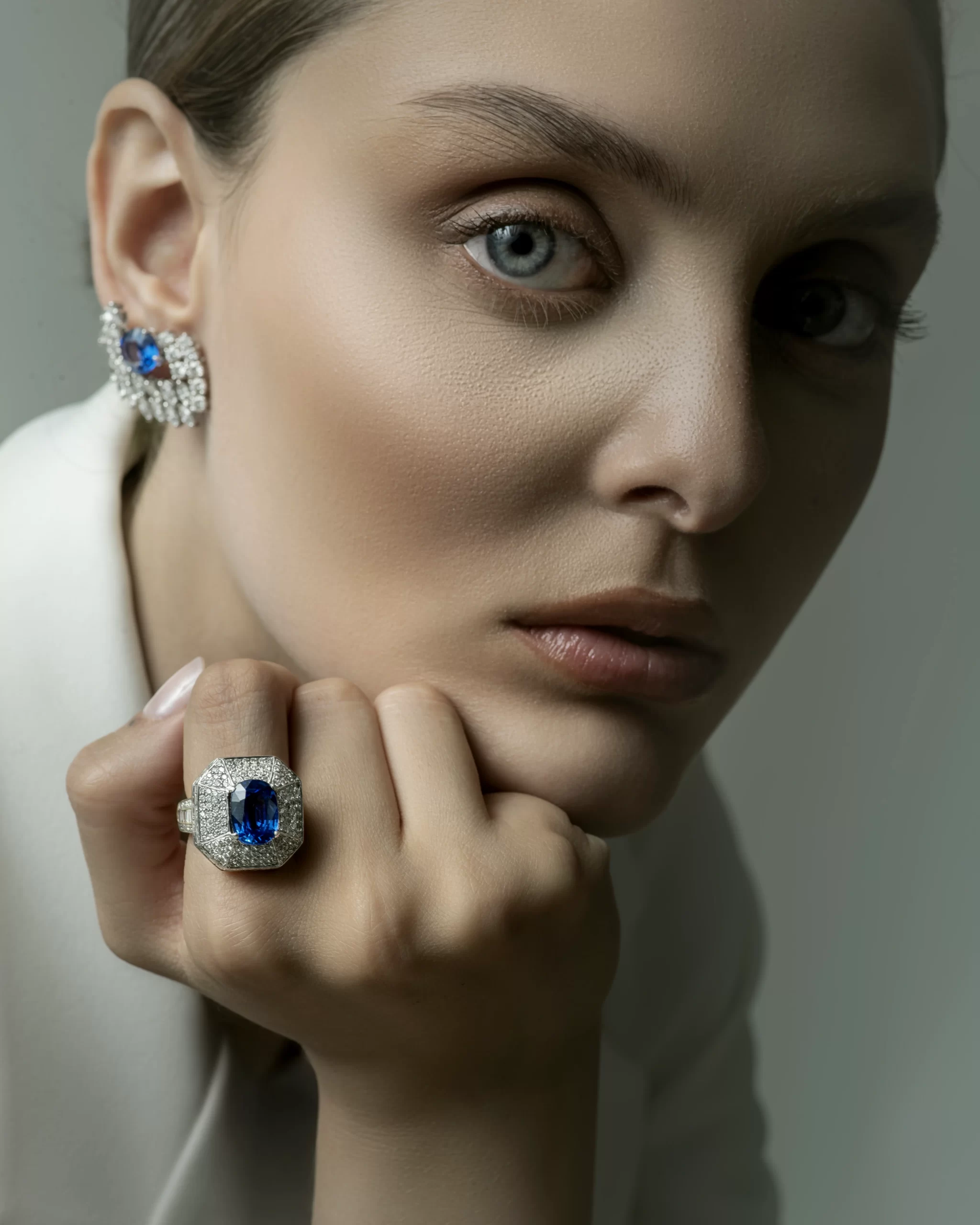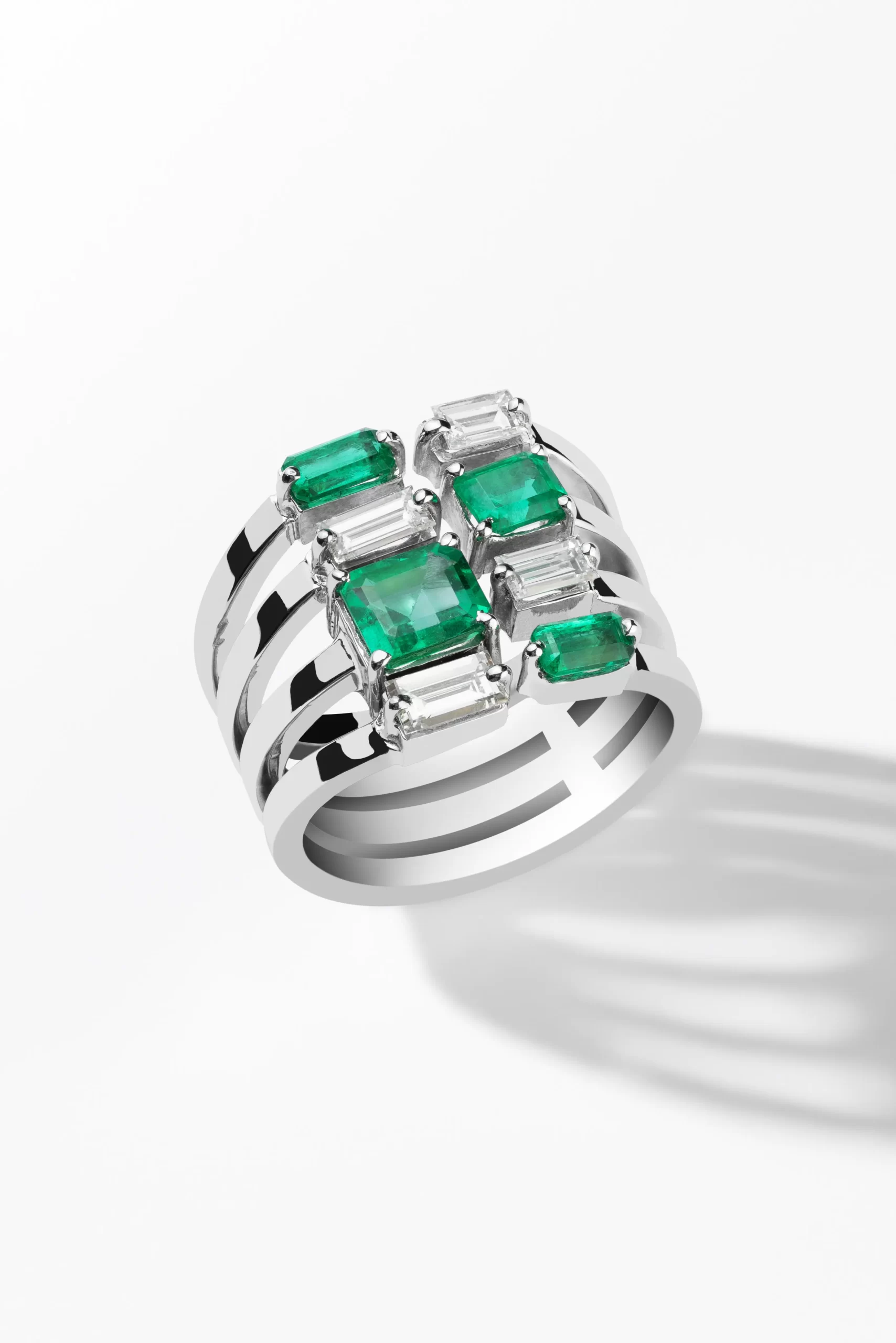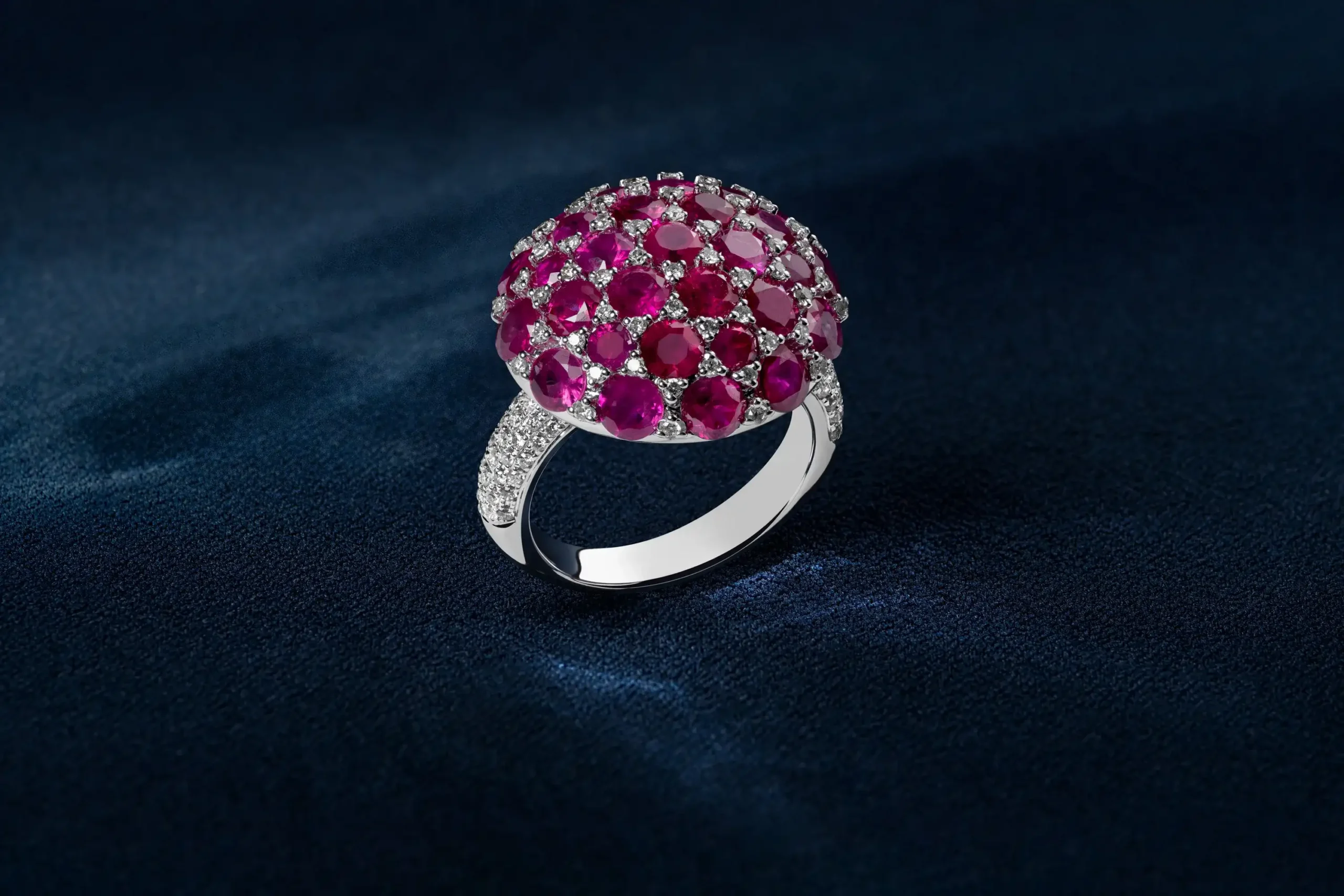 Ring A minimal setting drawing the eye to a magnificent stone Mesmerizing sparkle of brilliant-cut ruby cluster ring crafted in white gold.