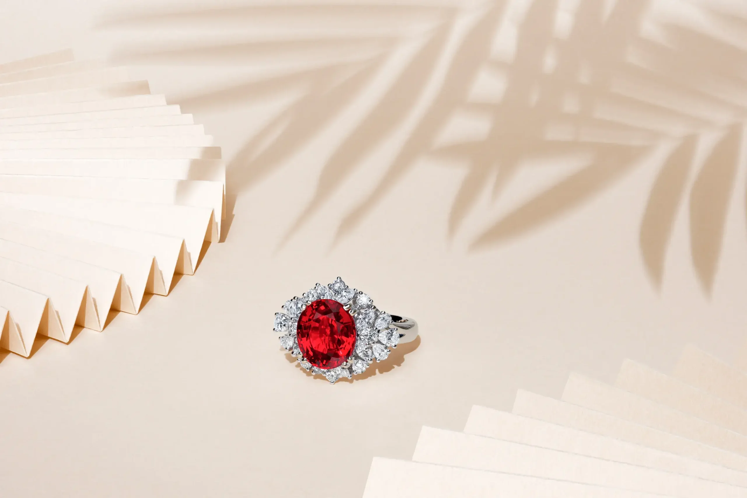 Mesmerizing sparkle of brilliant-cut ruby cluster ring crafted in white gold.